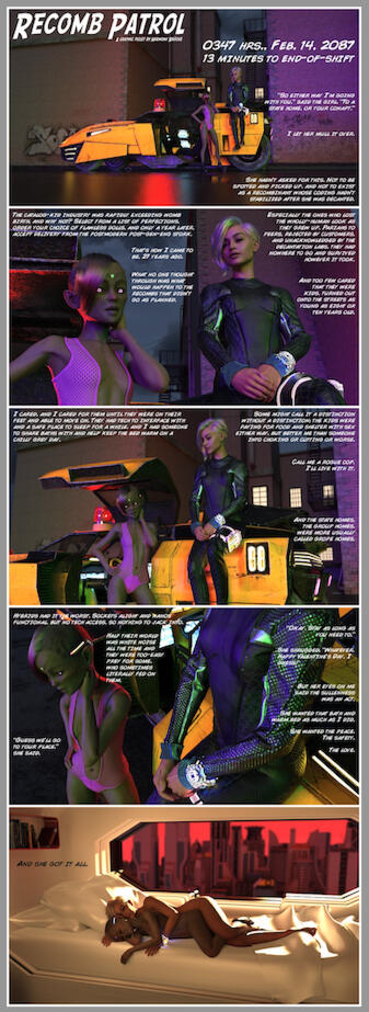 An experiment with imagery and text that tells of some of the repercussions of a future wherein genetic engineering (recombination) is a mass-market reality, and children are reduced to commodities that can be made to order from catalogues.Too short to be a short story, this is more like a transgressive, semi-erotic haiku with about 93 extra syllables (fewer than 400 words). 1620x4560-pixel JPEG.